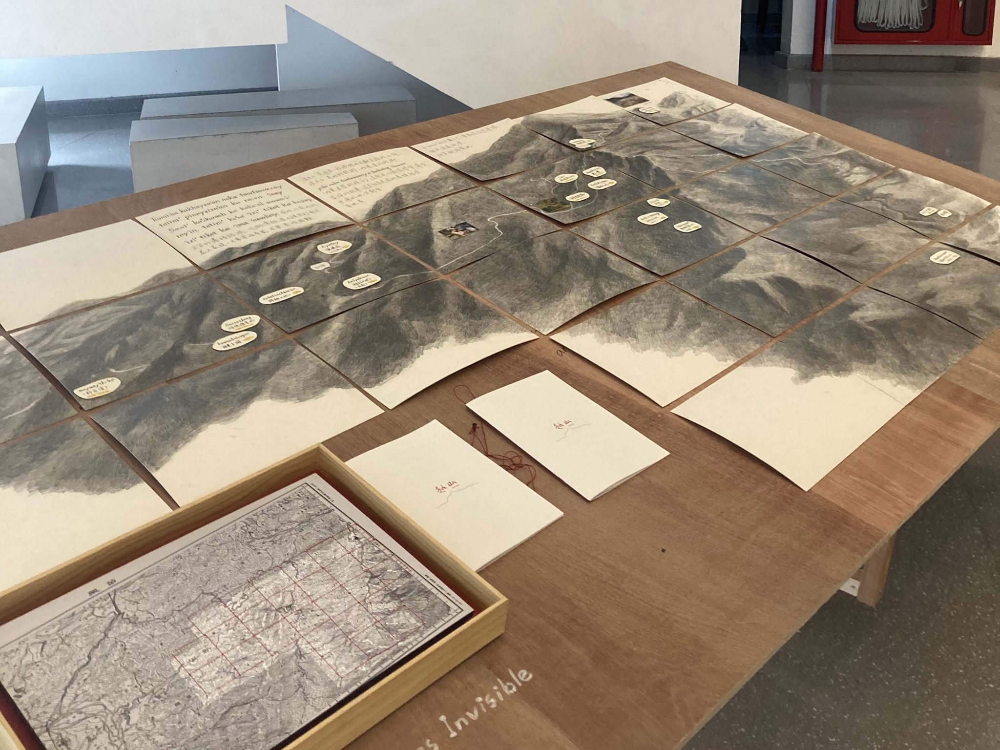 Sekalipun demikian, pengunjung masih bisa mengapresiasi beberapa karya secara individu seperti “Lohizaw Mountain Crossing” Project (2021) karya Yi-Jen Dou (hewen). Project ini dipajang di Galeri Oesman Effendi, diletakan pada sebuah bidang kayu tripleks dengan kemiringan kurang lebih 30 derajat dari permukaan lantai galeri, dan ketinggian sekitar 30 cm. Di atas permukaan itu kita melihat 29 lembar kertas seukuran A3, dijejerkan rapih dengan gambaran kontur sebuah wilayah pegunungan menggunakan pensil. Di bagian kiri bawah bidang tersebut, terdapat sebuah gambar peta di dalam bingkai, dengan penanda garis-garis berwarna merah di dalamnya. Di bawah peta ini kita bisa membaca sebuah tulisan: Recording Place Names Invisible on Modern Maps. Kualitas drawing yang baik, serta keputusan untuk menempatkannya dengan kemiringan yang spesifik memberikan kesan tiga-dimensional yang istimewa. Seolah kita berhadapan dengan sebuah diorama. Teks yang dihadirkan memberikan rujukan mengenai persoalan penghapusan (erasure) dalam peta modern, mengizinkan kita melakukan tafsiran lain akan sejarah dan asal-usul masyarakat atau tempat yang ‘dihilangkan.’