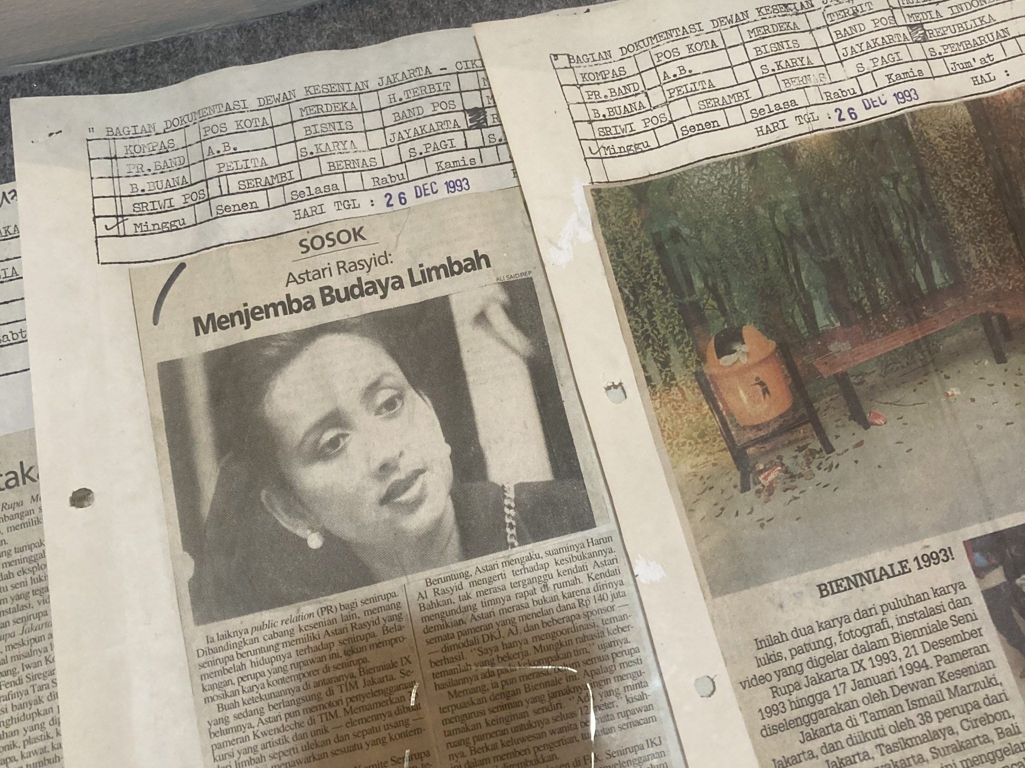 Di Galeri S. Sudjojono, pengunjung bisa melihat model pameran arsip yang menyajikan sejarah Jakarta Biennale dari masa ke masa di ruangan yang sama. Bagian pameran arsip ini menjadi istimewa sebagai tempat kita melihat dan membaca kembali perjalanan Jakarta Biennale. Lebih penting lagi, dalam beberapa artikel koran dan dokumentasi foto, para pengunjung bisa melihat penyelenggaraan Jakarta Biennale IX, 1993, tidak terlepas dari peran krusial dua perempuan: Toeti Heraty (1932-2021) dan Astari Rasyid (1953-2022). Harus diakui bahwa peran ‘di belakang layar’ kedua perempuan ini seringkali tak terbaca dalam setiap pembahasan mengenai Jakarta Biennale IX, yang lebih banyak menyoroti peran sentral kurator pameran dan gagasan pascamodern-nya yang problematis itu. Dengan struktur seperti ini, pola kuratorial Jakarta Biennale seolah mengadopsi apa yang sering disaksikan di ajang art fair: ketika sebuah peristiwa seni menampilkan galeri-galeri yang memiliki otoritas masing-masing untuk membuat rancangan pameran dan pemilihan karya di dalamnya. Pembedanya tentu saja gagasan, motivasi ekonomi dan keterkaitan antarpeserta di dalam kedua peristiwa tersebut.