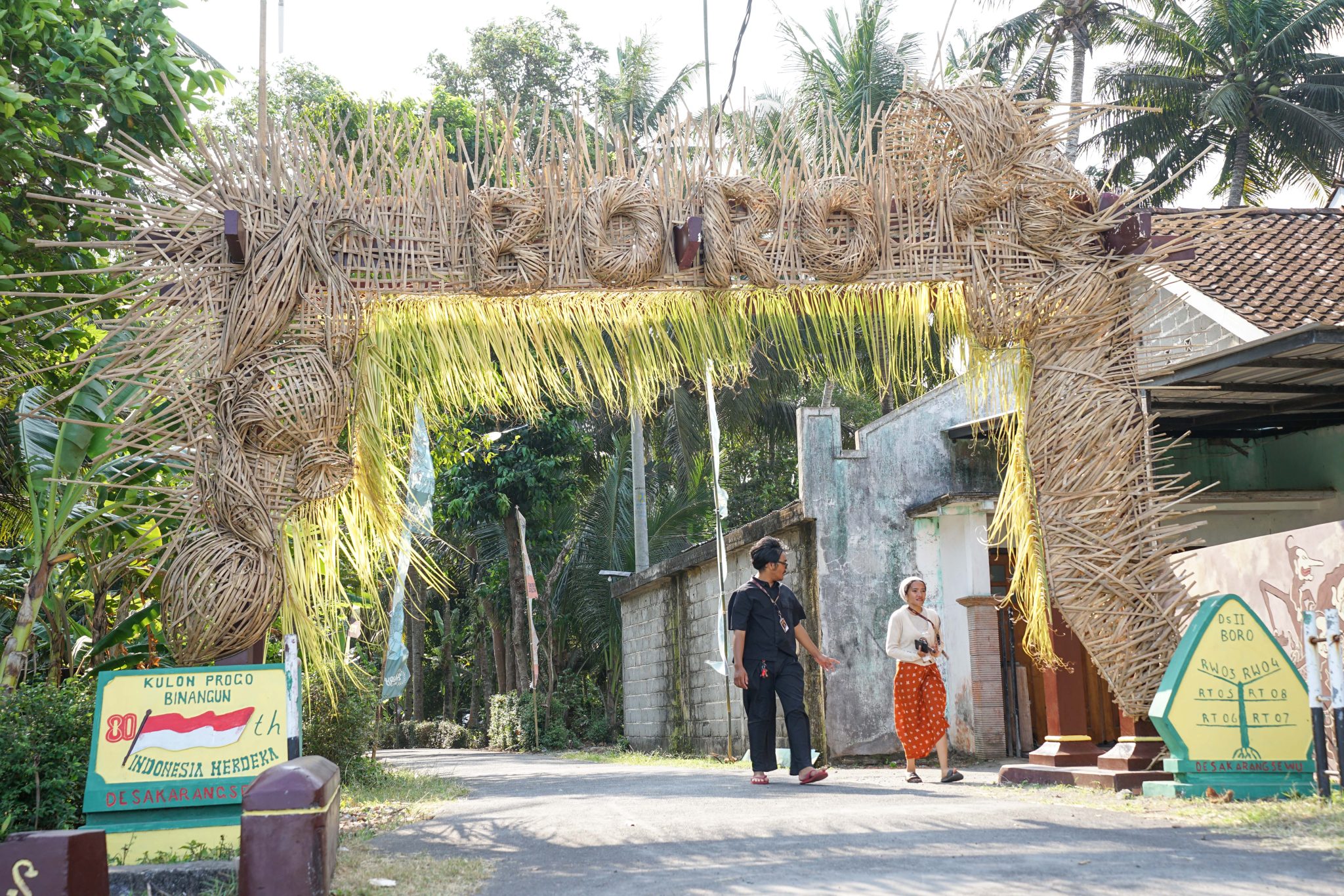 Ternyata karya-karya itu tersebar di ruang terbuka. Kami mesti menyusuri seisi Padukuhan Boro II untuk berjumpa dengan karya-karya yang dipamerkan. “Lewat sini ya,” ujar si panitia pada saya sembari menunjuk selajur jalan berlapis semen di sisi kanan Pendopo Karang Kemuning.