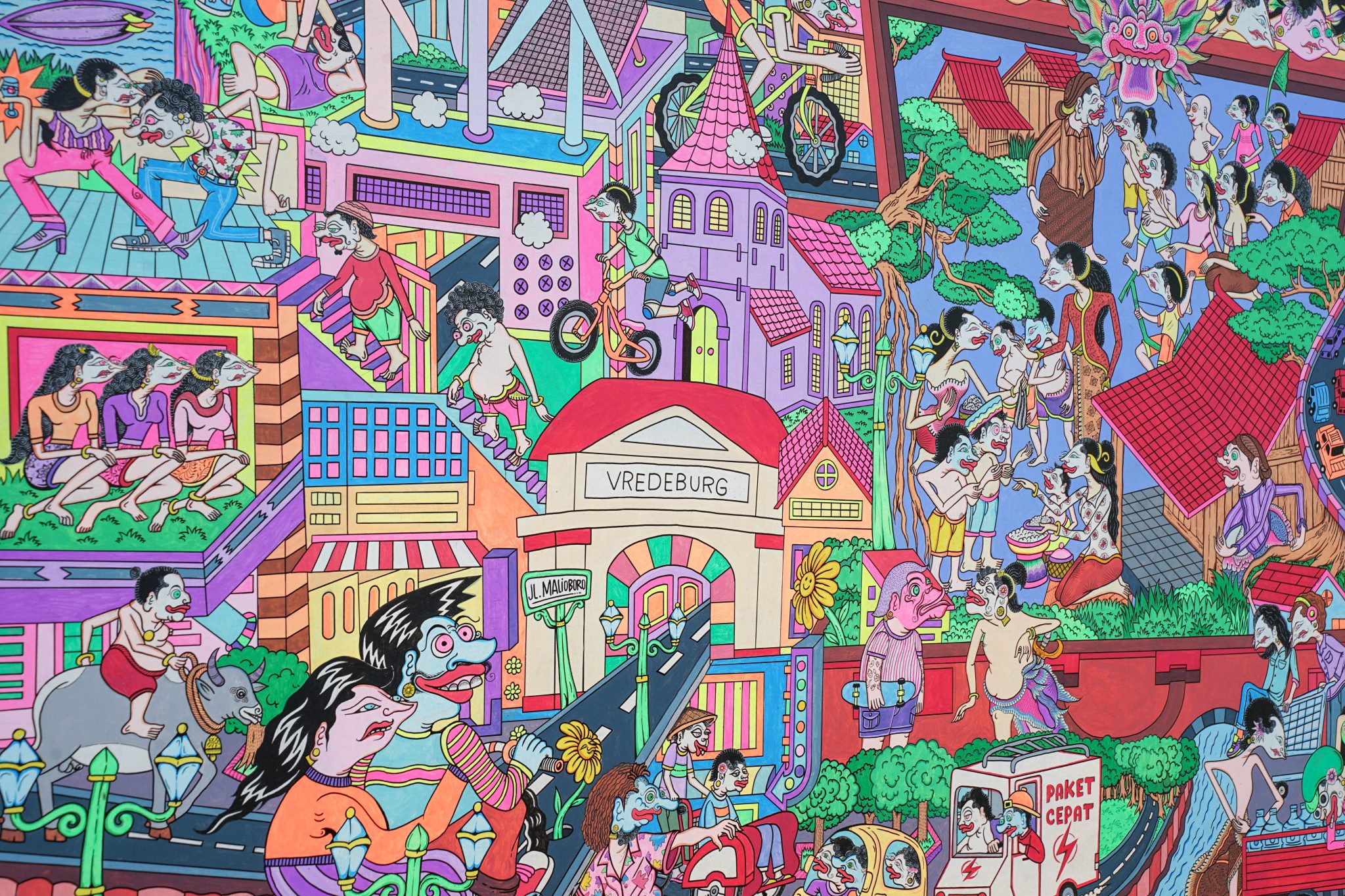 Saya dan ibu saya berjalan menyusuri arah yang ditunjuk panitia tadi. Sedangkan ayah saya menempuh jalan lain, ia mengikuti sekelompok bule yang turut mengunjungi Prananing Boro. Setelah beberapa langkah, akhirnya saya menemukan lukisan Faris Wibisono di tikungan jalan. Judulnya “City Roots”. Lukisan itu menggambarkan sekumpulan wayang yang berada di tengah hiruk-pikuk kota. Sapuan kuasnya mewarnai para wayang dan sekelilingnya dengan warna mencolok dari cat akrilik. Melihat warna-warnanya yang semarak dan saling bertabrakan, saya ikut terbawa. Rasanya ikut diserang keramaian kota. Siapa dari kita yang tidak penat dengan kepadatan transportasi pribadi, akibat lemahnya transportasi publik di Yogyakarta.