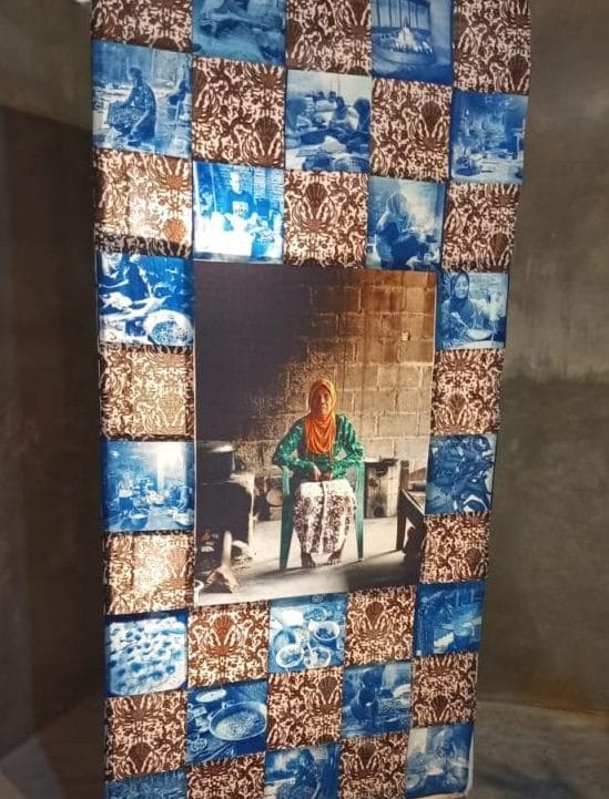 Cukup lama saya memandangi karya Barikly. Tiga kain jarik membungkus papan berbentuk prisma segitiga. Masing-masing kain punya motif berbeda. Di setiap kain, terpajang foto-foto Mbah Dalini, Mbah Sukar, dan Mbah Pademo, tiga perempuan lanjut usia asal Boro, yang berlatarkan dapur.