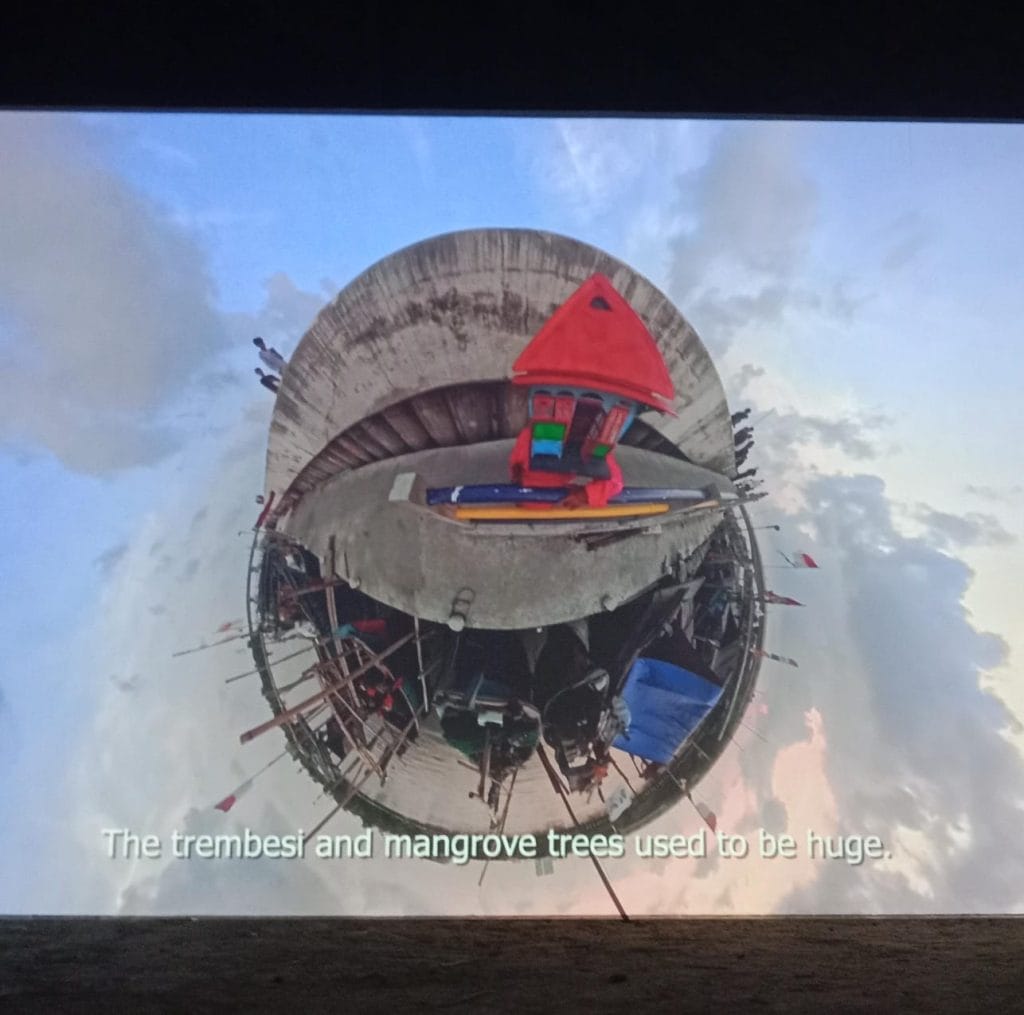 Di bagian tengah, juga ditampilkan film “Wong Balik Wadon Pungkasane”. Di film ini diceritakan tentang kisah Mak Item dengan keluarganya. Dia menjadi perempuan satu-satunya dari Kampung Dadap yang pernah bekerja sebagai nelayan. Tubuh Mak Item menyimpan jejak luka terkait penggusuran, banjir rob, yang membuatnya menua dengan tangguh. Ia menceritakan bagaimana ingatan dan kenangannya akan seni bertahan di tengah kehidupan yang rentan. Ucapan Mak Item yang paling membuat saya berkesan saat menonton, “Binatang saja punya kandang, apalagi manusia.” Saya seperti tertampar mendengarnya. Mak Item dan suaminya semacam memakai helm berbentuk rumah. Film itu dengan detail memperlihatkan kondisi yang dialami si ibu ketika banjir tiba, bagaimana kehidupannya ketika banjir, dan bagaimana mereka bertahan hidup. Juga dijelaskan tentang sejarah Kampung Dadap, serta konflik status tanah warga setempat yang belum jelas sampai sekarang.