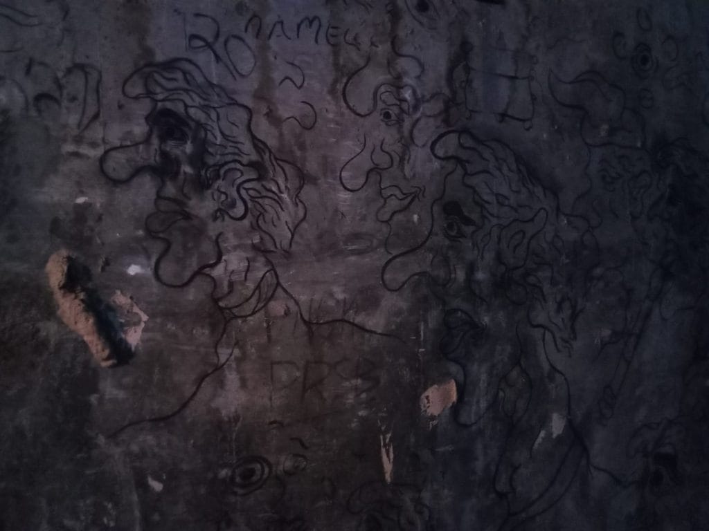 Tembok-tembok dalam ruangan itu telah menjadi kanvas yang digambar Mali dengan imajinasi-imajinasinya. Gambar itu dibuat dengan media arang, pensil, pulpen, spidol, dan pusparagam alat gambar lainnya. Dia menggambarkan berbagai bentuk hingga kata-kata. Dia melukis konstelasi gambarnya dengan figur misterius: tubuh manusia, wajah, huruf-huruf aneh, garis-garis majemuk yang luwes dan dinamis. Tentang Mali, saya tertarik saat Iwang menulis, “Barangkali perasaan depresiku di masa lalu (mungkin juga masih ada hingga kini) menjadi jembatan yang menghubungkan aku dengan kesendirian Mali—kesendirian yang sakral namun liar dalam lanskap brutal.” Entah kenapa, melalui kalimat ini, saya juga ikut merasa terhubung. Ada kelindan yang kadang aneh untuk dijelaskan.