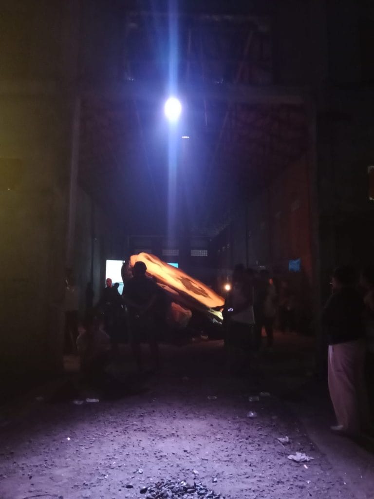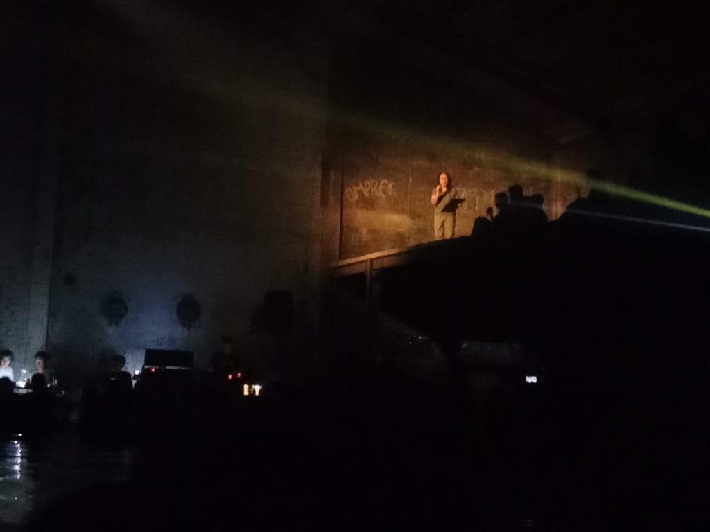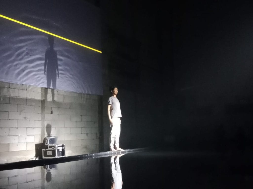 Usai dari Studio Mali, kami menuju ruang sebelah yang juga sangat luas di Gudang Pertunjukkan. Ruangan bergaya industrial itu berbentuk persegi panjang dengan tembok tampak berwarna abu-abu. Di tengahnya ada kolam memanjang lumayan besar yang menjadi panggung utama seniman tampil. Secara arsitektur, void ruangan itu cukup tinggi, kita juga bisa melihat tangga lain yang menuju mezzanine ruangan yang digunakan oleh salah satu pancernya untuk melakukan deklamasi. Jauh di atas kolam juga dipasang dua lukisan karya Ella Wijt. Lukisan ini bergambar pohon trembesi dan beton yang terinspirasi dari kisah leluhur setempat yang kehilangan rumah, setelah pohon trembesi terakhir di sana ditebang tuntas. Di tengahnya ditampilkan sorotan LCD bertuliskan judul pertunjukkan “ARIARIKURAKURAMATAMATA: Yang Muncul Kala Tenggelam” (The Placenta, The Turtle, The Spy: What Rises from the Sunken).