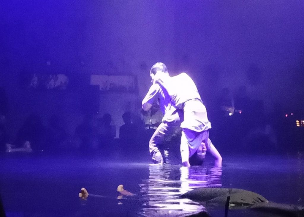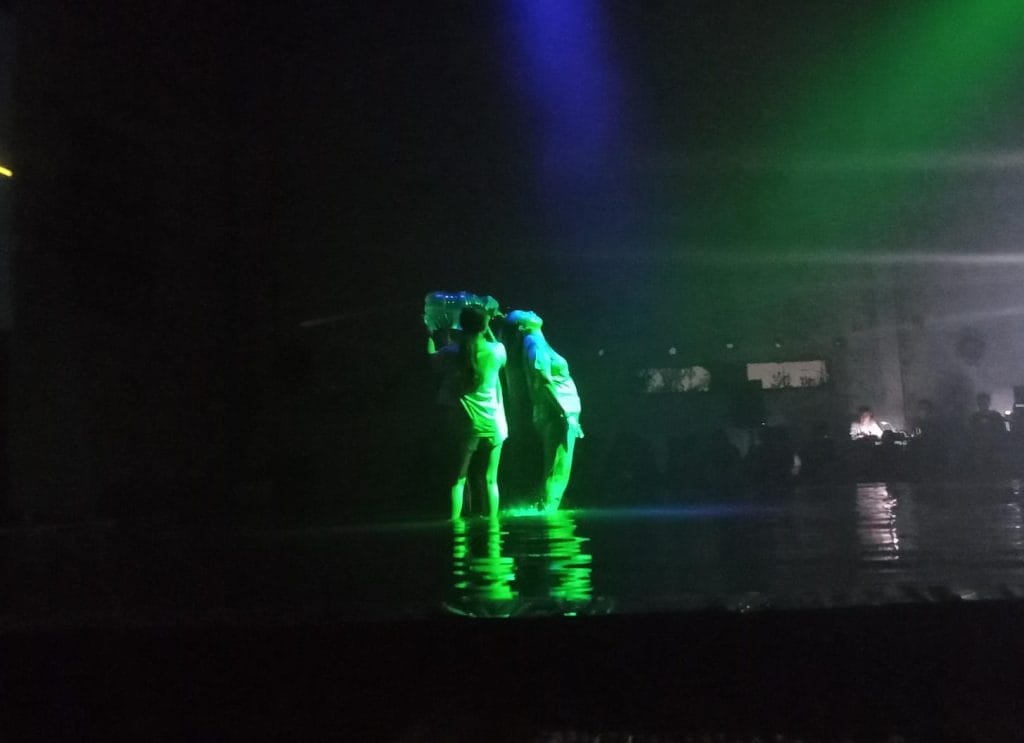 Pertunjukkan diawali dengan Irwan Ahmett yang mengelilingi pinggiran kolam sembari membangun komunikasi dengan penonton. Dia berkeliling hingga sampai di bawah sorotan LCD yang menampilkan satu garis horizontal berwarna kuning dengan latar hitam. Garis ini mengingatkan saya dengan garis dalam elektrokardiogram saat pasien menghembuskan nafas terakhirnya. Di sana, Iwang mengeluarkan air seni yang merembes dari celananya, tiga orang bocil (bocah cilik) yang duduk di depan saya bilang dengan spontan, “ngompol, ngompol,” kata mereka. Sementara seorang ibu warga setempat yang berpakaian daster, yang duduk tak jauh dari saya melihat pertunjukkan dengan wajah seperti bertanya-tanya.