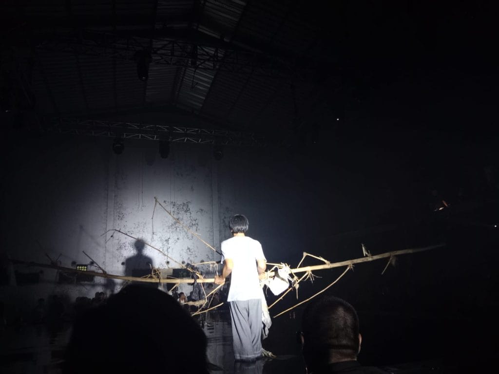 Dan saya sungguh meminta maaf karena di tengah jalannya pertunjukkan, saya sekitar tiga puluh menit harus mengalihkan fokus saya yang lain ke pekerjaan. Sebab mendadak saya diberi tanggung jawab pekerjaan. Saya harus menyelesaikan tulisan yang butuh langsung dikerjakan saat itu juga. Ya, beginilah realita pengalaman saya dalam menonton. Saya kembali fokus saat pertunjukkan olah tubuh dari Agata Megumi. Bagi saya tariannya sangat indah, lentur, luwes, dan saya hanya bisa melongo melihat bagaimana tubuh bisa jadi sarana penyampai pesan yang handal. Saya tak bisa 100 persen mengartikan gerak tarian para aktor, tapi saya bisa merasakan perasaan getir yang para aktor bawakan. Juga ada deklamasi lagi dari Dinar Pandan Sari. Kemudian, diakhiri para aktornya seperti, saya tidak tahu apa sebutannya, tapi dalam imajinasi saya tampak seperti melakukan tarian kecak. Kaki mereka bergetar seperti detak yang cepat dan masing-masing seperti membuat gerakan memutar. Gerak kaki para pancer di atas tanah itu seolah juga menegaskan bahwa tanah punya daya spiritual: ia perlu disapa lewat detak kaki, sebagai ritual penghormatan pada tradisi, hasil bumi, serta kehidupan yang dikandungnya. Lalu, ada semacam manifesto, para kru dan panitia yang membagikan botol kecil berisi kepada beberapa penonton, dan berakhirlah pertunjukkan.