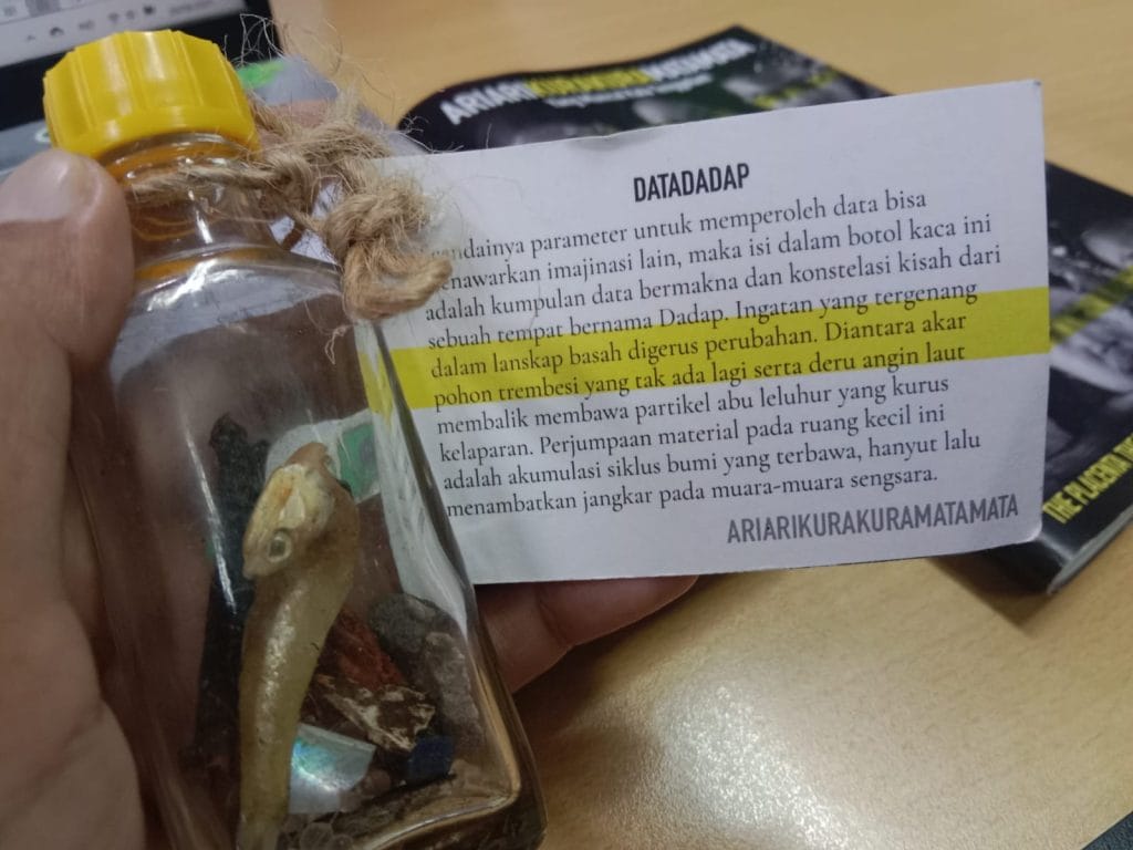 Saat kami pulang, para peserta di dalam bus menuju titik kumpul akhir, para peserta diberikan oleh-oleh yang diberi judul “DATADADAP”. Cendera mata itu berbentuk sebuah botol minyak telon bening bertutup warna kuning berisi seekor teri, pecahan kerang, biji tanaman, kayu kecil, batu khas, akar trembesi, partikel abu leluhur, hingga benang warna putih yang menyerupai jaring nelayan. Semua terakumulasi menjadi parameternya sendiri yang unik dan khas.