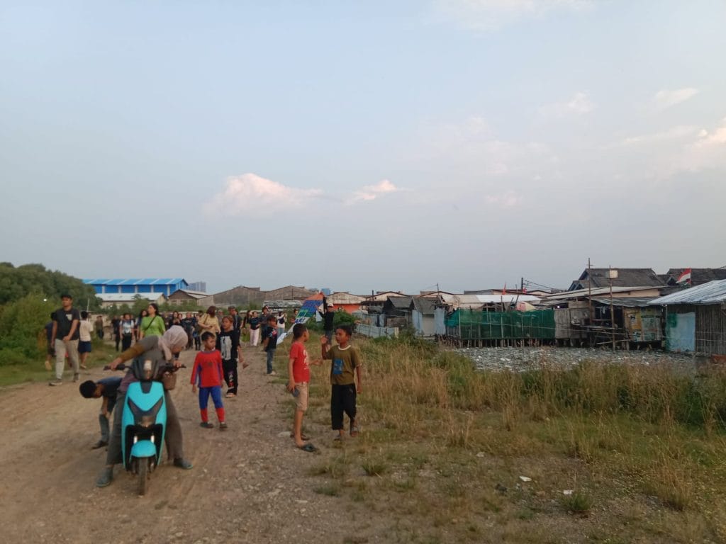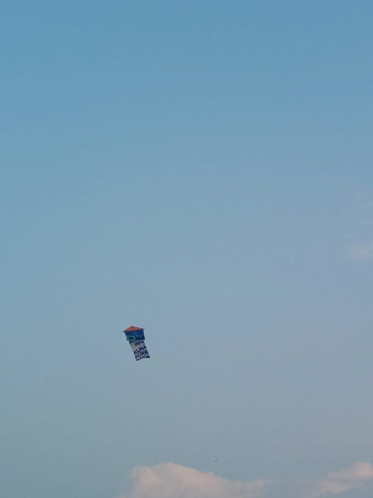Ada warga sekitar yang sedang bersantai, melaut, atau anak-anak yang sekadar bermain di area tanggul. Di sana juga diterbangkan layang-layang berbentuk rumah dengan ekor bertuliskan ARI ARI KURA KURA MATA MATA. Sesekali suara pesawat terbang yang mengarah ke Bandara Soetta lewat di atas kami. Iwang menggambarkan kondisi ini dengan kalimat, “langit yang dirobek mesin jet”. Suaranya yang menggelegar besar perlahan mulai mengecil hingga akhirnya senyap.
