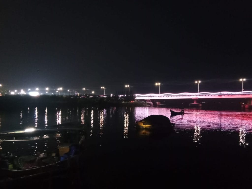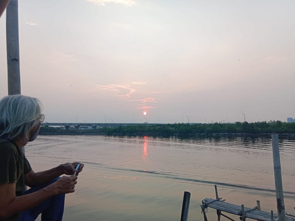 Setelah rombongan di bus 1 dan 2 berkumpul, panitia memberikan kami arahan dan kami berjalan menuju kawasan tanggul laut. Di sana kami melewati rumah-rumah warga yang terlihat seperti habis kebanjiran, jejak abrasi yang masih terlihat, sisa-sisa reruntuhan bangunan, bau kerang hijau melintas, aroma banjir dan lumpur, dan sesekali udara laut semilir membelai wajah. Burung-burung camar melintas. Ketika naik ke atas tanggul laut, kami bisa melihat senja berwarna orange dari matahari yang berbentuk bundar berada di sisi Barat. Cahaya senja itu menyambut kedatangan kami dengan sinarnya yang hangat. Cahaya keemasan itu memantul di atas laut, menorehkan bayangan semu pada air muara yang berwarna hitam. Udang, ikan, dan makhluk akuatik lainnya pun rasanya bakal gerah hidup di perairan butek seperti itu. Di atas tanggul itu, kami diajak menunggu kedatangan kura-kura.