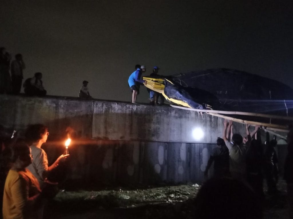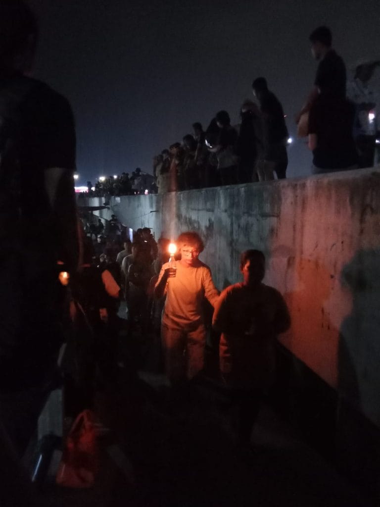 Kami menunggu ketibaan kura-kura yang menjadi focal point setelah matahari benar-benar tenggelam dan langit mulai berwarna abu-abu. Usai Magrib, kura-kura raksasa seukuran dua sampan nelayan dijejerkan berjalan pelan. Dari jauh tampak seperti kue nastar besar warna hitam atau serupa batu kali yang merambat melewati jembatan yang dua sisinya dihiasi lampu-lampu memanjang berwarna merah dan putih. Rasanya, jembatan itu serupa dunia lain yang memisahkan antara Kampung Dadap dengan salah satu kawasan elite Jakarta, Pantai Indah Kapuk (PIK) yang tersohor dengan kehidupan mewah dan mahalnya. Keindahan jembatan yang didesain dengan selera kiwari itu seperti mengejek rumah-rumah bedeng warga kampung. Dari atas tanggul, tanpa teori ndakik-ndakik apa pun, kita bisa melihat ketimpangan dengan jelas. Dalam temaram usai Magrib, saat mendekat dan semakin dekat, saya mendapat kesan kura-kura itu hidup. Kura-kura itu ternyata memiliki kaki dan kepala yang bergerak-gerak. Mengiringi perjalanan kura-kura itu, saya mendengar suara serupa perkusi yang ditabuh menghasilkan suara “dung, dung, dung”.