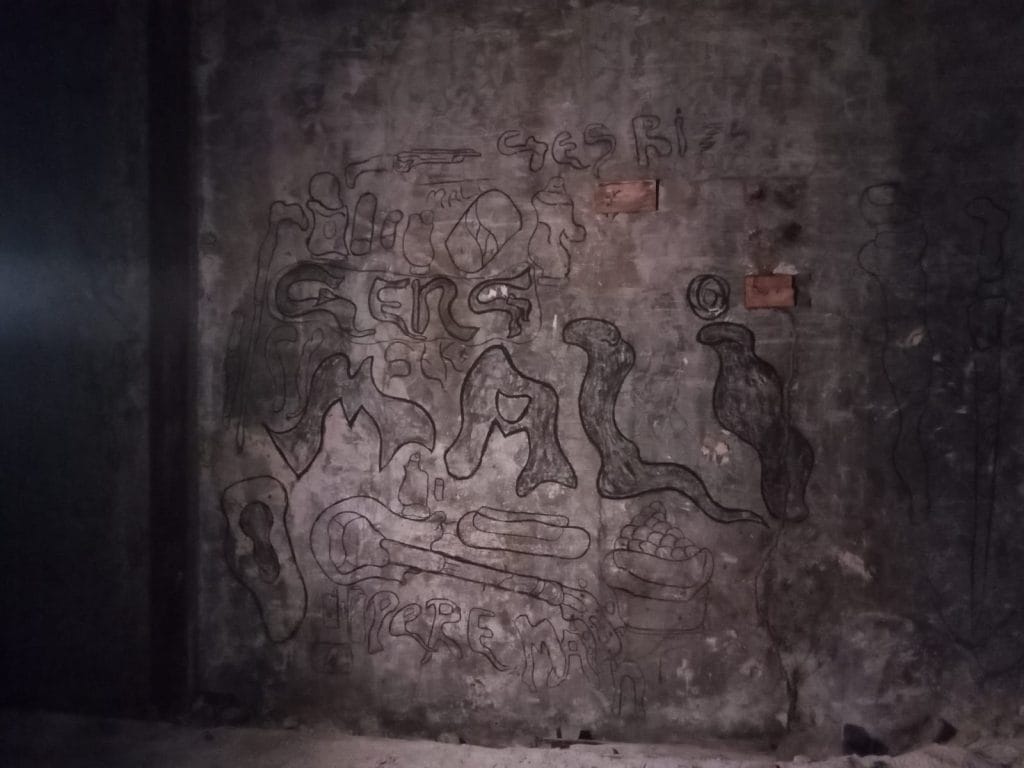 Tembok-tembok dalam ruangan itu telah menjadi kanvas yang digambar Mali dengan imajinasi-imajinasinya. Gambar itu dibuat dengan media arang, pensil, pulpen, spidol, dan pusparagam alat gambar lainnya. Dia menggambarkan berbagai bentuk hingga kata-kata. Dia melukis konstelasi gambarnya dengan figur misterius: tubuh manusia, wajah, huruf-huruf aneh, garis-garis majemuk yang luwes dan dinamis. Tentang Mali, saya tertarik saat Iwang menulis, “Barangkali perasaan depresiku di masa lalu (mungkin juga masih ada hingga kini) menjadi jembatan yang menghubungkan aku dengan kesendirian Mali—kesendirian yang sakral namun liar dalam lanskap brutal.” Entah kenapa, melalui kalimat ini, saya juga ikut merasa terhubung. Ada kelindan yang kadang aneh untuk dijelaskan.