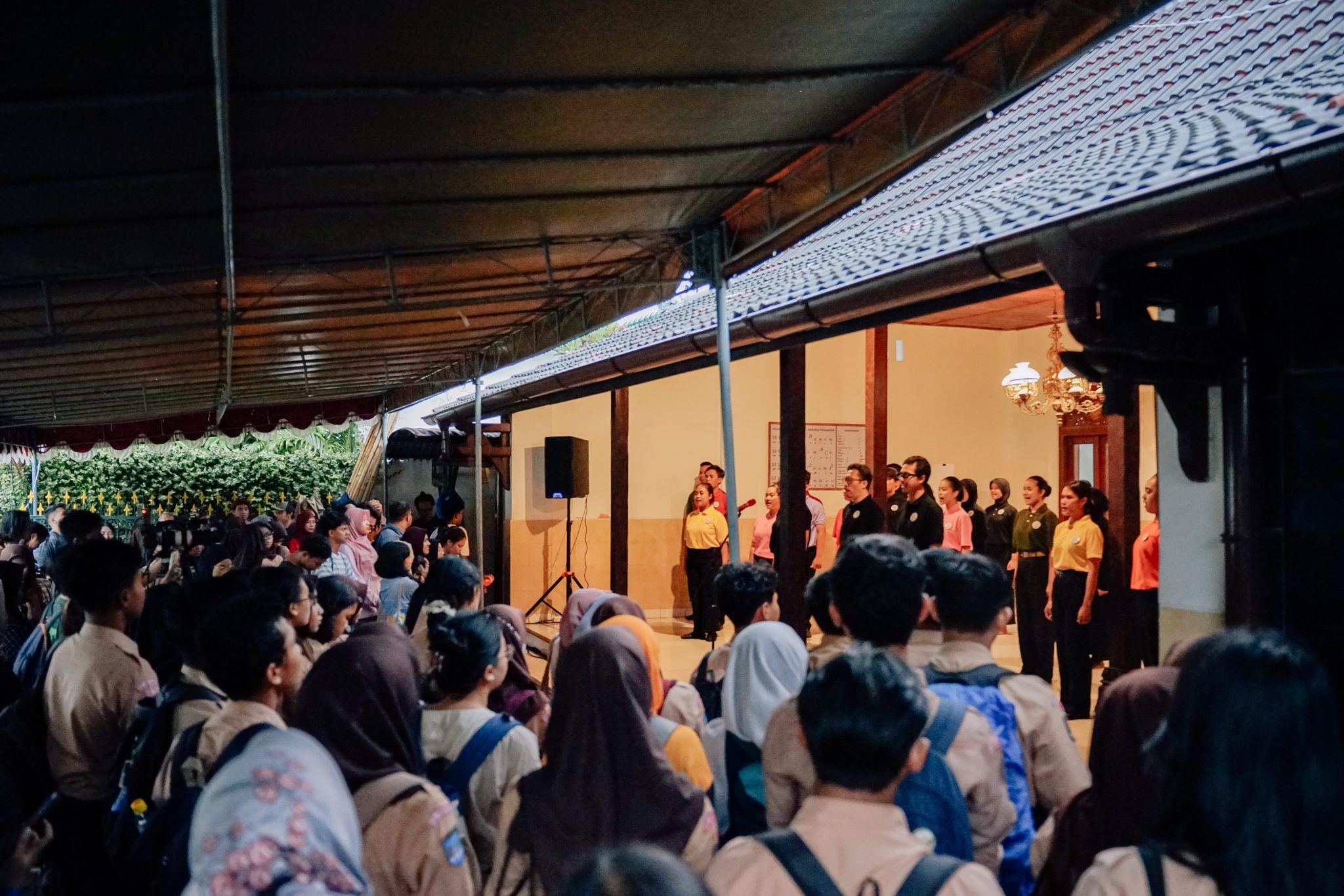 Para penonton telah memenuhi halaman rumah Suryoputran, kami berteduh dari rintik hujan, Kepala Pamong yang diperankan oleh Ahmad Jalidu menyambut kedatangan kami dengan menyanyikan Mars Adhi Dharma, mars yang tercipta hasil spekulasi fiksi itu, seketika menggugah semangat kami, mars itu diaransemen oleh Madha Soentoro. Kepala Pamong dan para pengajar Adhi Dharma dalam pertunjukan itu bernyanyi dengan lantang dan semangat, mengalahkan gaduh suara hujan di luar.