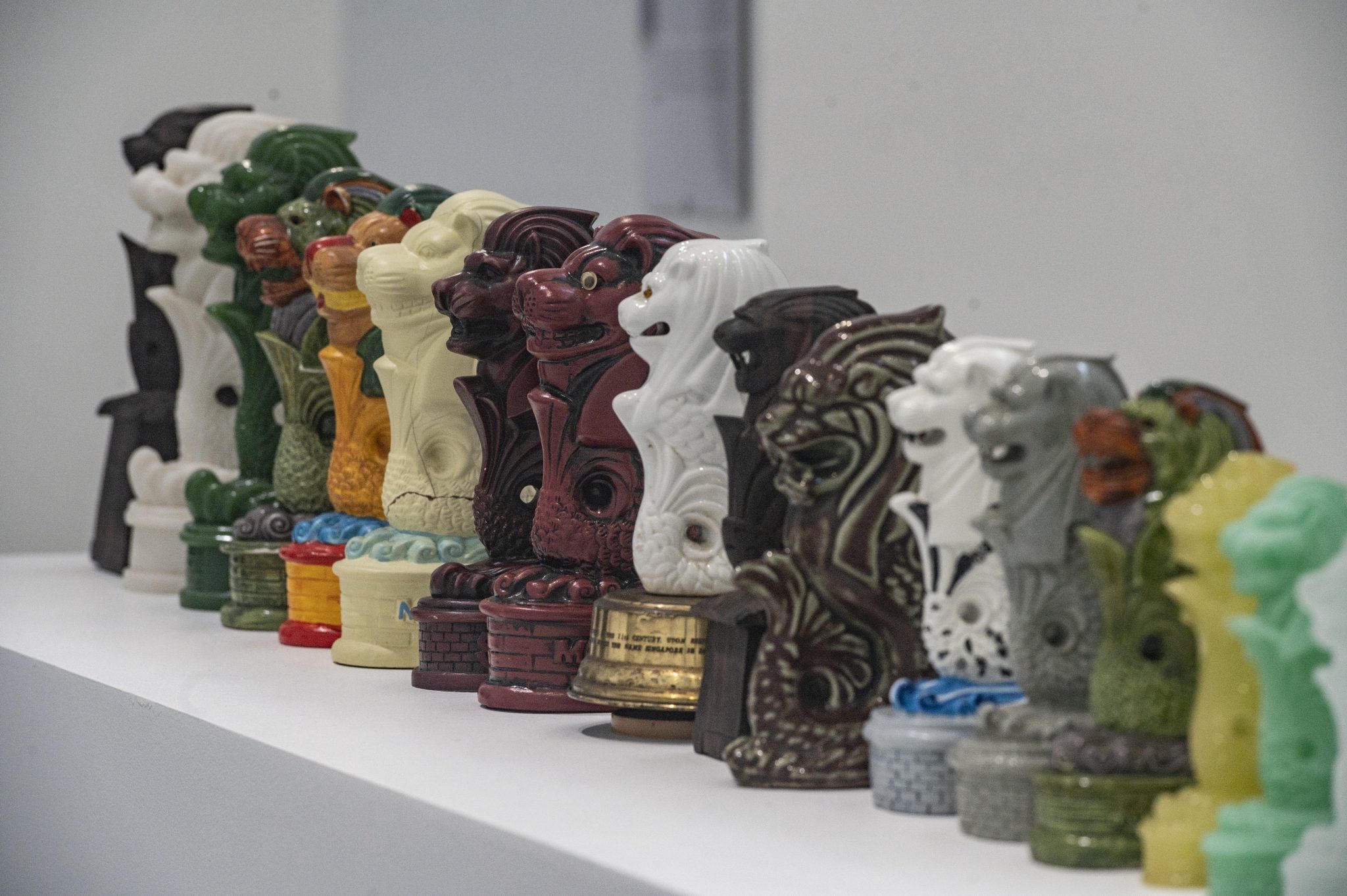 Ketika menyoal konstruksi imajiner Singapura itulah, kita perlu bergeser pada karya yang paling mencolok menyasar kesingapuraan. Tak lain adalah karya Ang Song Nian (b. 1983) bertajuk “Your Blank Stare Left Me at Sea.” Betapa tidak, ikon Singapura yang masyhur, yakni Merlion, sengaja disusun secara cermat dalam formasi miniatur melintang bak sebarisan pasukan. Sekilas sederhana tetapi sangat kuat sebagai susunan objek konseptual.
