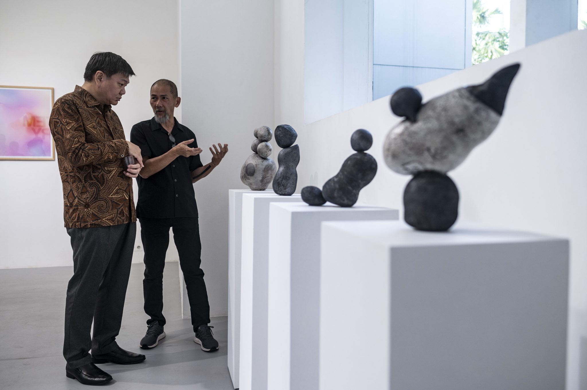 Terkait seniman yang terakhir, Jason Lim, ia memang dikenal kerap melakukan eksplorasi dimensi spasial dan temporal. Seniman yang juga kondang dengan performance art menghancurkan keramik ini menampilkan serial karya “Balancing Rocks”; dengan sengaja menampilkan metafora keseimbangan dalam miniature tumpukan bongkah-bongkah seperti batu.