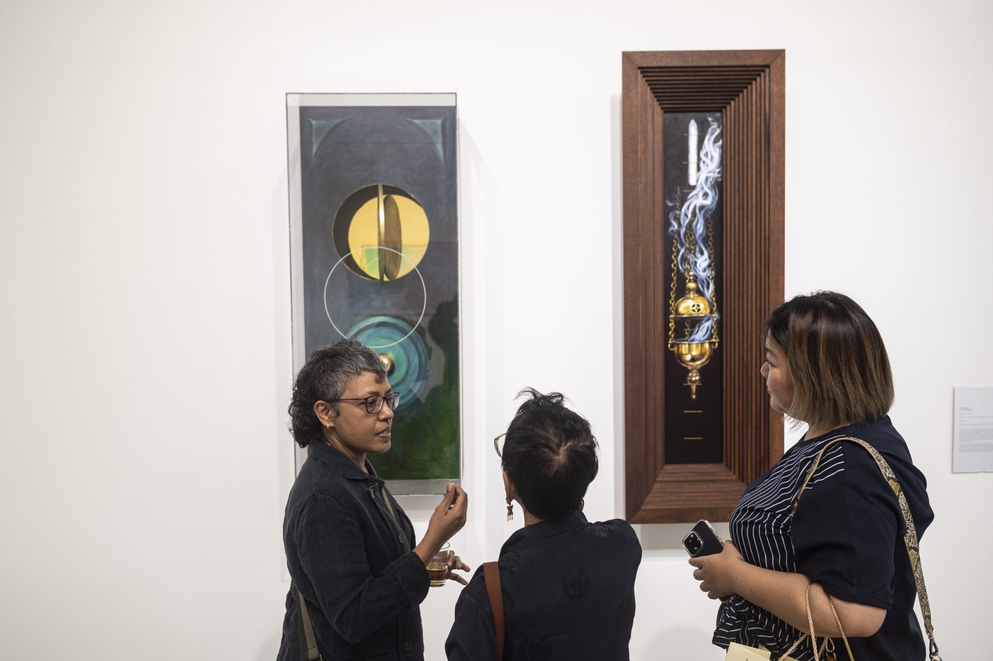 Namun ketika saya mengamati Susie Lingham sebagai seniman dalam pameran ini, saya menemukan tawarannya yang berbeda. Lewat karyanya “Measure in Myrrh,” Lingham menghadirkan representasi dupa dan asap. Menurut Liza, hal ini menjadi isu tentang mengukur sesuatu yang tak bisa diukur. Sedang menurut Tung sendiri, karya Lingham, termasuk karya “Rhyme in π (phi),” berupaya menyelidiki titik temu antara filsafat, matematika, dan kosmos, yang terurai dalam alam bawah sadar.