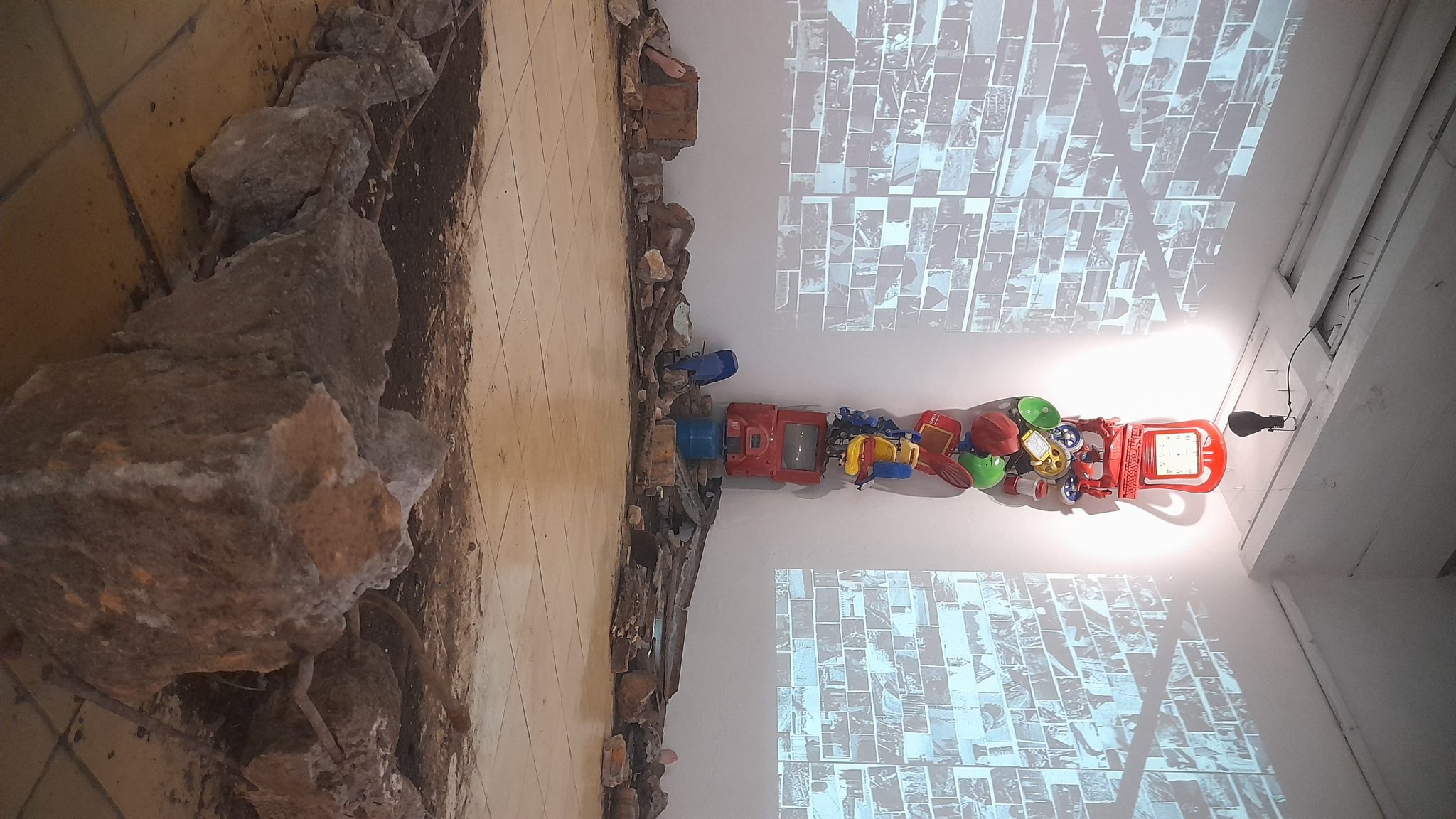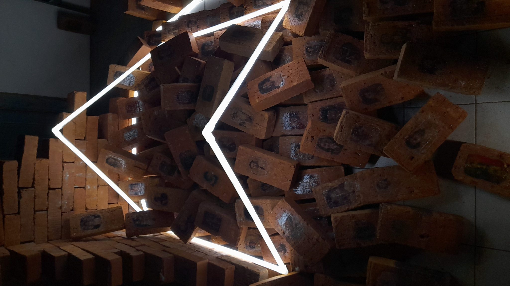 Pindah dari karya Nisa, saya berjumpa kehancuran lainnya. Arif Furqan menghadirkan imaji rumah yang runtuh dalam karyanya, Pieces and Paradox. Saya sempat celingak-celinguk mencari karya Furqan, ternyata instalasinya nyempil di gudang Cemeti, tertutupi tirai hitam. Di lantai gudang, batu bata berserakan seperti bekas reruntuhan rumah, sebuah ‘lampu’ berbentuk atap menyala di atasnya. Pada batu bata itu, tertempel foto-foto potret lawas, wajah-wajah tanpa nama. Foto-foto itu adalah hasil temuan Unhistoried, sebuah proyek pengarsipan foto keluarga era Orde Baru. Pieces and Paradox hendak menghadirkan jejak kepunahan ingatan tentang rumah dan keluarga. Furqan melihat sisi paradoks dari foto keluarga dan rumah. Keduanya kerap diciptakan sebagai siasat untuk mengekalkan peristiwa, mengabadikan ingatan. Tapi, keduanya juga sekaligus rentan ditinggal dan dilupakan.