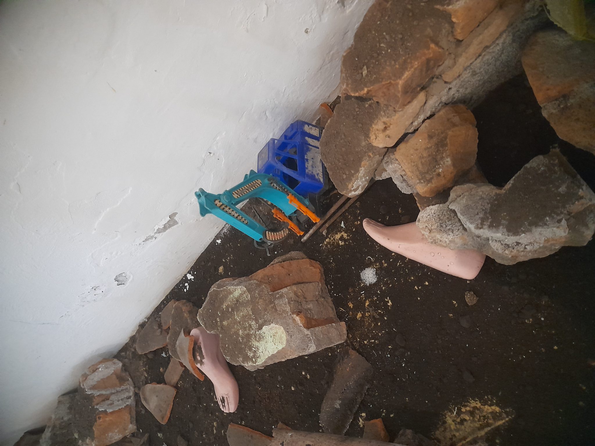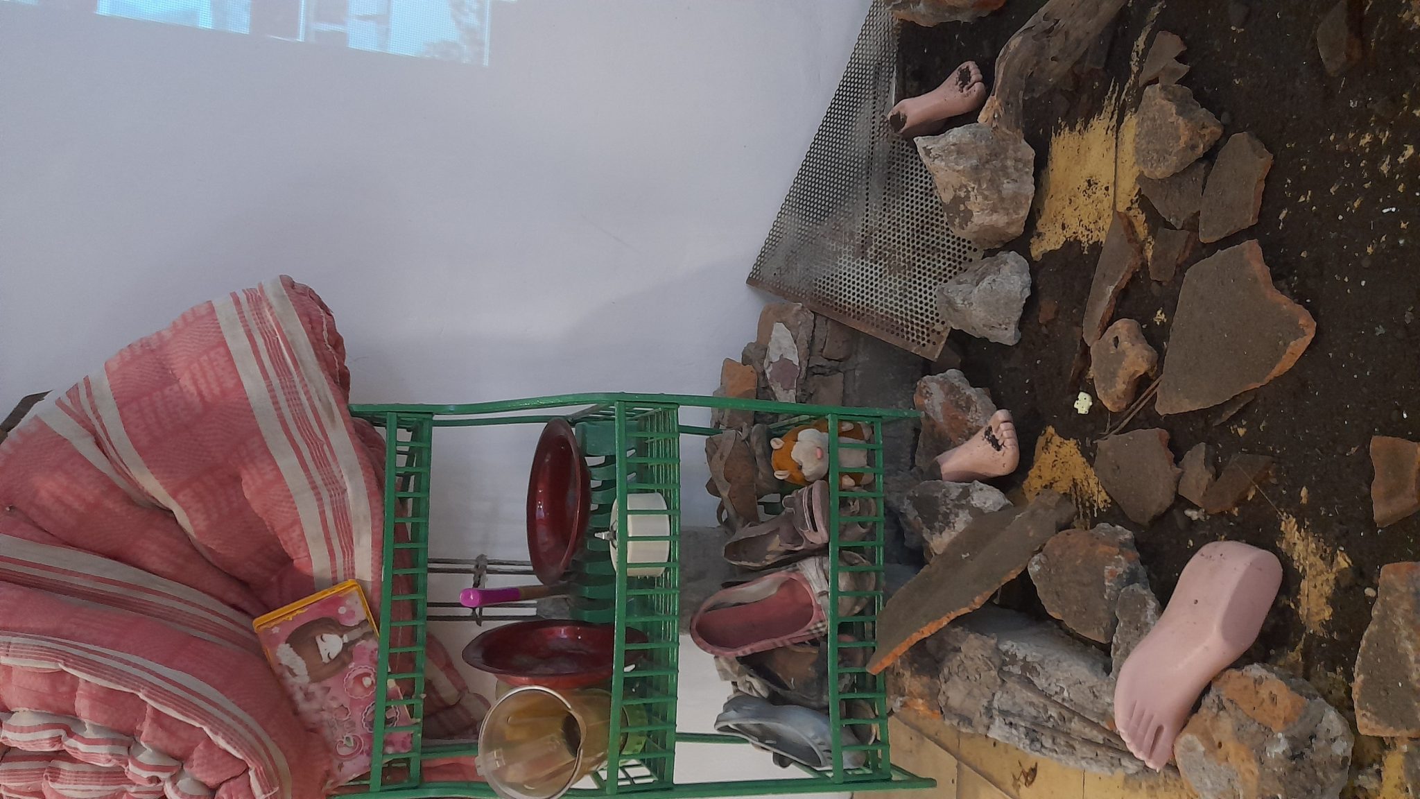 Selanjutnya, saya beralih ke miniatur tragedi persis di hadapan Jagongan Dana Desa. Ini karya Nisa R.A, berjudul Playgrounds of Resilience 2, yang berjangkar pada ingatan atas tsunami Aceh 2004 silam. Nisa menghadirkan puing-puing, bongkahan bahan bangunan, dan berbagai perabot rumah yang telah ambyar seolah sudut Cemeti yang satu itu baru saja dihantam kiamat sugro. Kumpulan foto situasi pasca-tsunami Aceh ditembakkan ke dinding melalui proyektor. Mainan anak-anak dan manekin telapak kaki berserak di sekujur reruntuhan. Manekin kaki itu hadir seperti bagian tubuh yang disuir-suir lalu disebar ke segala penjuru, sebuah detail yang membuat saya terhenyak dan mual.