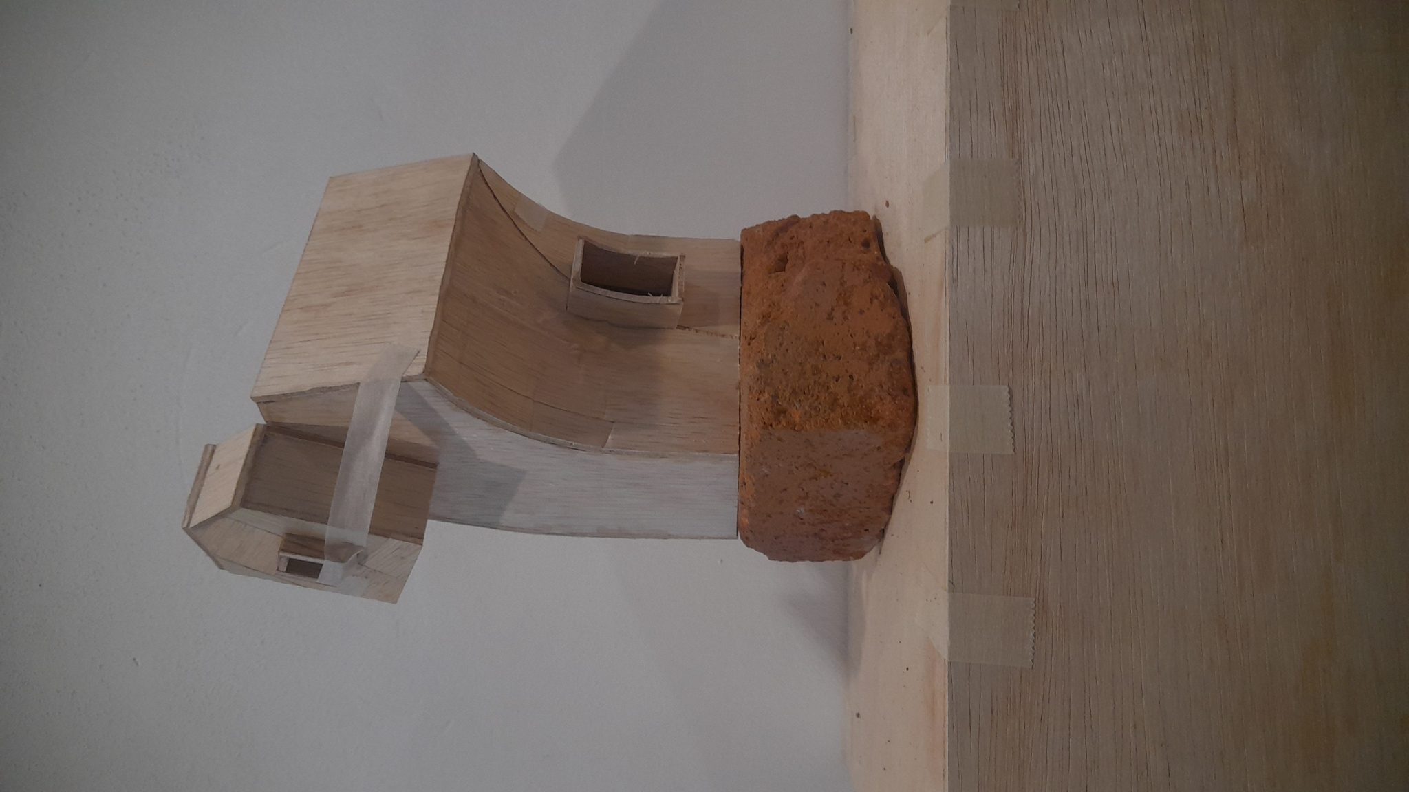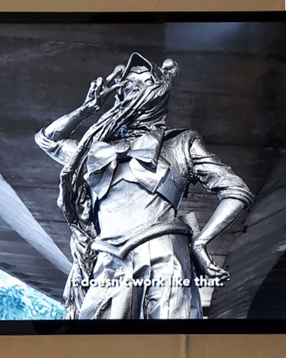 Bergeser dari karya Dian, saya masuk lebih dalam ke ruang pamer. Ada empat karya di sana, dan semuanya seolah berebut minta dilihat. Karya Mother Bank tentu saja paling menyita perhatian saya. Tapi, sebelum mengunjunginya, saya mampir dulu ke karya Alfiah Rahdini dan Octo Cornellius. Alfiah membuat sebuah patung fiber perempuan berhijab yang cosplay sebagai Sailor Moon, patung ini dipamerkan di beberapa area di Kota Bandung. Alfiah merekam berbagai respons masyarakat atas kehadiran patung itu, video rekaman inilah yang ditampilkan di Cemeti. Keseluruhan karya Alfiah sendiri dijuduli Sailor Moonah. Sementara itu, Octo bermain-main dengan material bata merah dan kayu. Karyanya tampak seperti display mainan anak-anak, hanya saja ‘mainan’ ini punya bentuk eksperimental. Ada yang tampak berbentuk perahu dan rumah, lainnya berbentuk entah. Octo menjuduli karyanya Tegak Di Antara yang Tunduk.