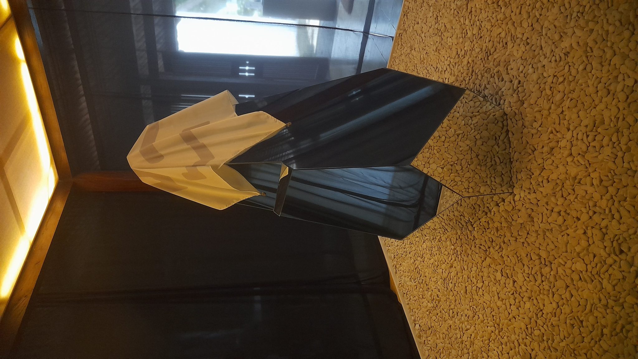 Tirai hitam itu ternyata membentuk ruang. Untuk masuk, tirai itu tidak disibak, ia membentuk semacam jalur berputar—seperti labirin. Menyusuri jalur tirai itu, saya serasa melangkah ke alam lain, atau ke situasi kelam yang ujungnya entah. Jalur itu mengantar saya pada semacam ruang persegi dengan kerakal putih terhampar di lantai. Ruangan yang terasa jembar dan cerah, sekaligus diselimuti tabir kenestapaan. Di tengah ruang, semacam obelisk kaca asimetris seukuran manusia berdiri tegak lurus dengan langit, sebuah kain putih menutupi bagian atasnya. Pada permukaan obelisk itu kita dapat bercermin.